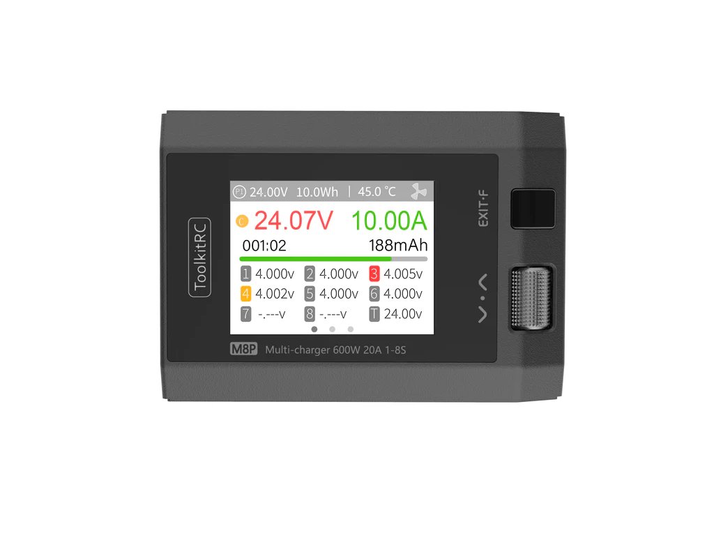ToolKitRC M8P-Akkuladegerät mit 600 W Leistung und der Fähigkeit, Akkuladungen von 1s bis 8s auszugleichen