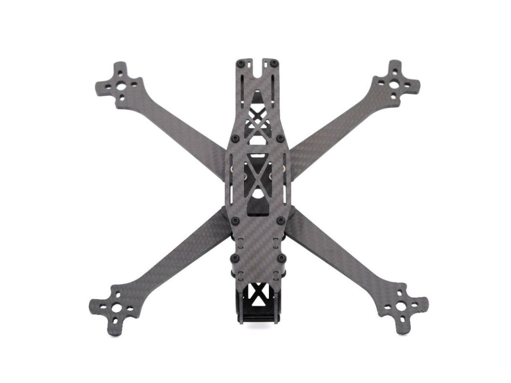 Der Rahmen verwendet eine Wide-X-Geometrie, die unter FPV-Piloten sowohl für Freestyle- als auch Akrobatikflüge beliebt ist. Die Konstruktion wurde auf maximale Haltbarkeit ausgelegt, um harte Abstürze und hohe Belastungen zu überstehen, bleibt dabei aber leicht und bietet viel Platz für alle gängigen FPV-Komponenten.