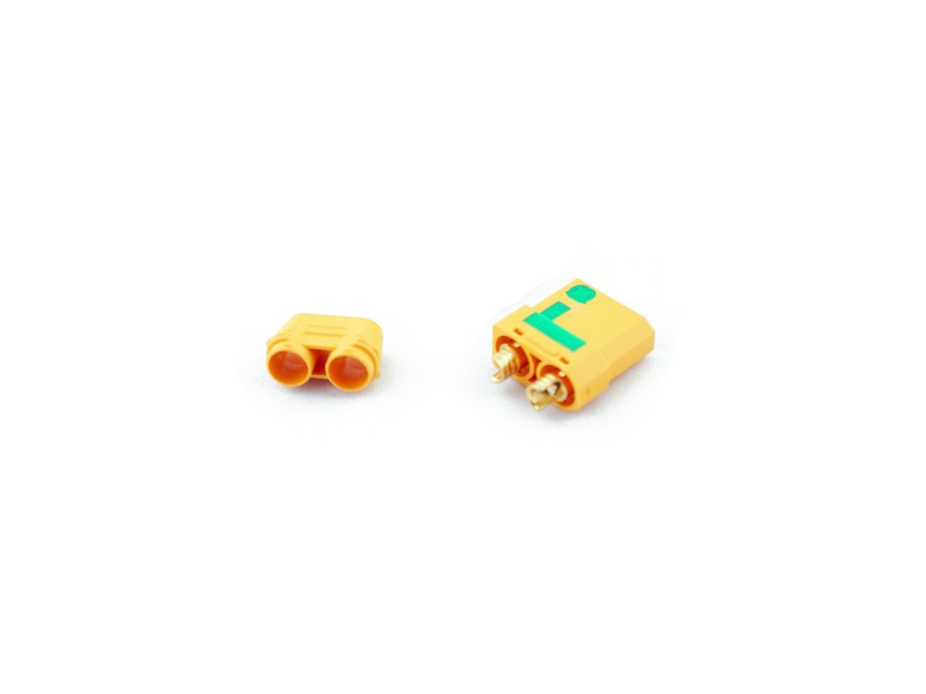 XT90-Stromversorgungsstecker in Antispark-Ausführung, bei der die Verbindung zunächst über einen integrierten Widerstand hergestellt wird, durch den die Kondensatoren an den Reglern mit einem kontrollierten Strom geladen werden. Dies verhindert unerwünschte Funkenbildung während der Verdrahtung, die den Stecker beschädigt und den Übergangswiderstand erhöht. Der Steckverbinder ist mit einer Kabelabdeckung versehen.