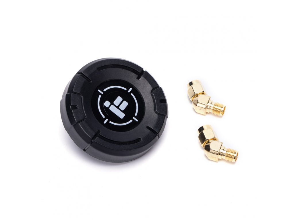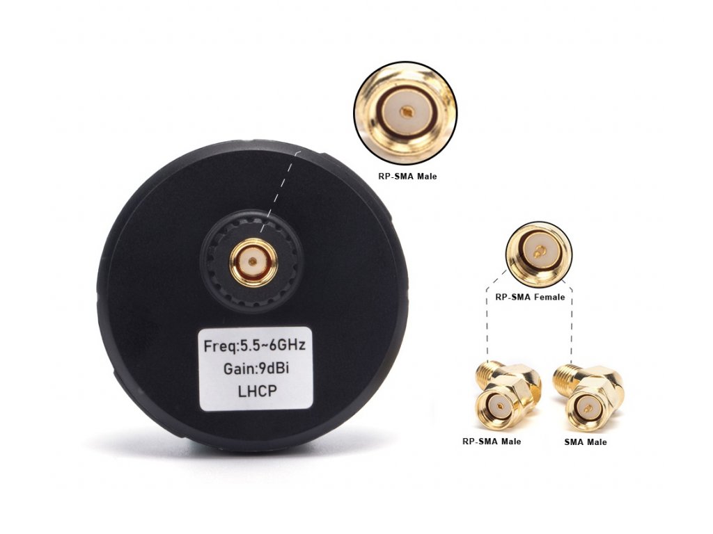 Directional antenna with circular polarization, gain 9dBi, vertical and horizontal radiation angle 75 degrees. Combined with the Iflight Crystal Patch Antenna on your DJI Googles V1/V2, you can achieve even greater signal range from your FPV copter than ever before. Comes with 45° adapters for both SMA and RP-SMA connectors.