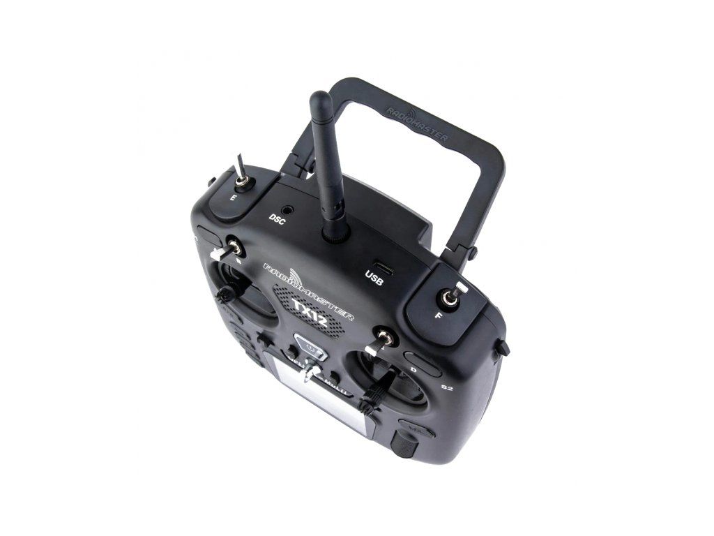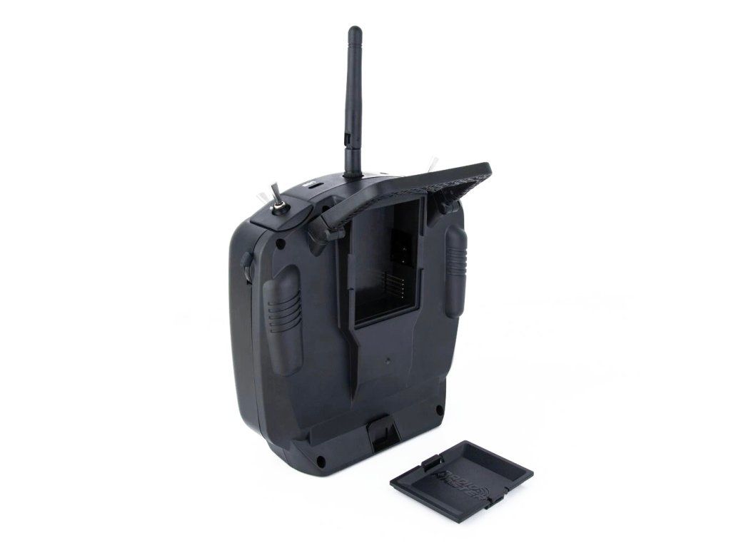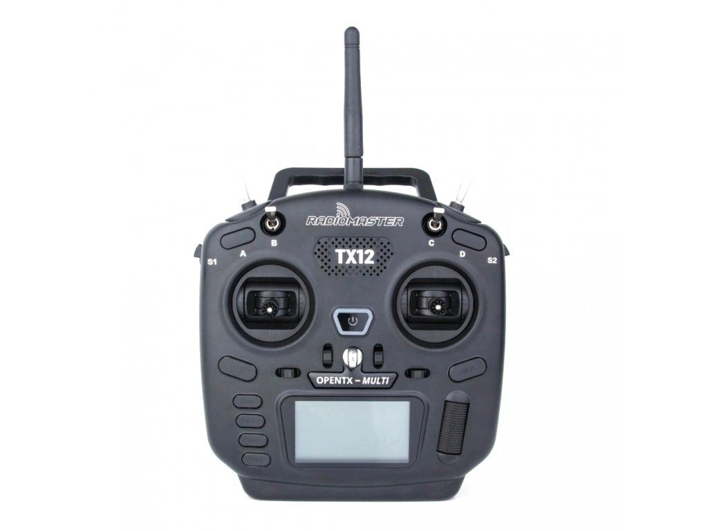 A scaled down version of the TX16S. It uses an integrated transmitter module with a CC2500 transmitter chip. The transmitter is capable of working with all receivers whose protocol works with the CC2500 RF chip. The module supports the Corona, Hitec, Futaba S-FHSS, Frsky D16/D8, RadioLink, Graupner HoTT and many more protocols based on the firmware used. The module supports direct firmware update. A monochrome display with 128x64px resolution is used for clarity of the transmitter settings. The transmitter can control up to 16 channels. The transmitter uses open source OpenTX firmware. TX12 includes a JR shaft and can be expanded with other external transmitter modules such as TBS Crossfire or Tracer