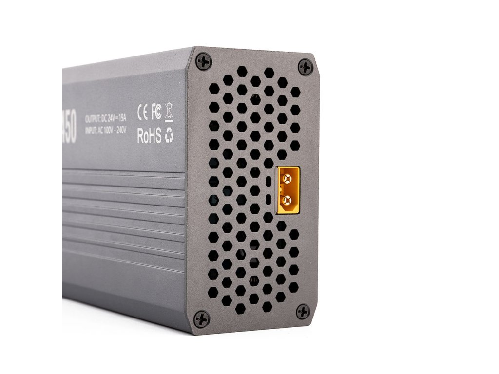 The power supply features comprehensive protection against short circuits, overload, and overheating. An integrated cooling fan ensures stable operation even under sustained heavy loads. Thanks to its XT60 output connector, the ADP450 is ideal for RC and FPV enthusiasts seeking an efficient solution for powering their chargers.