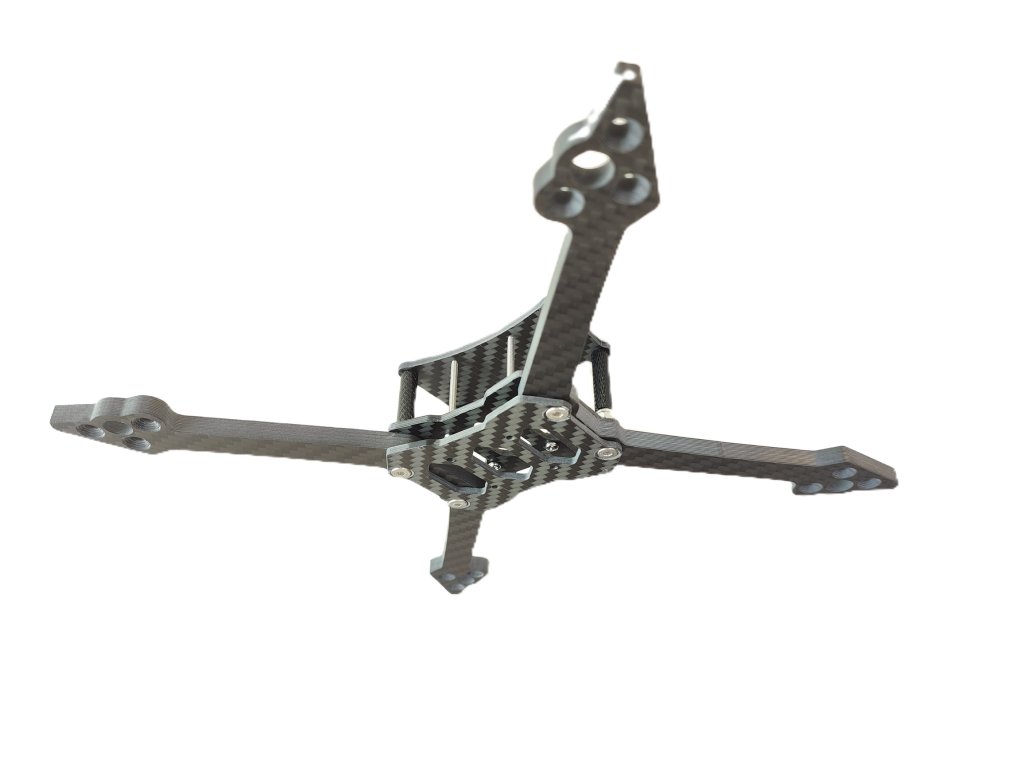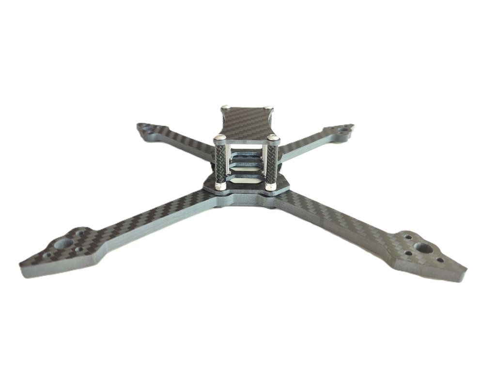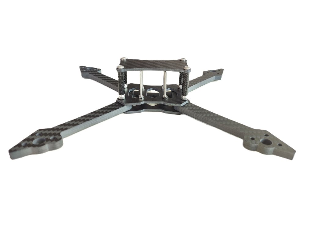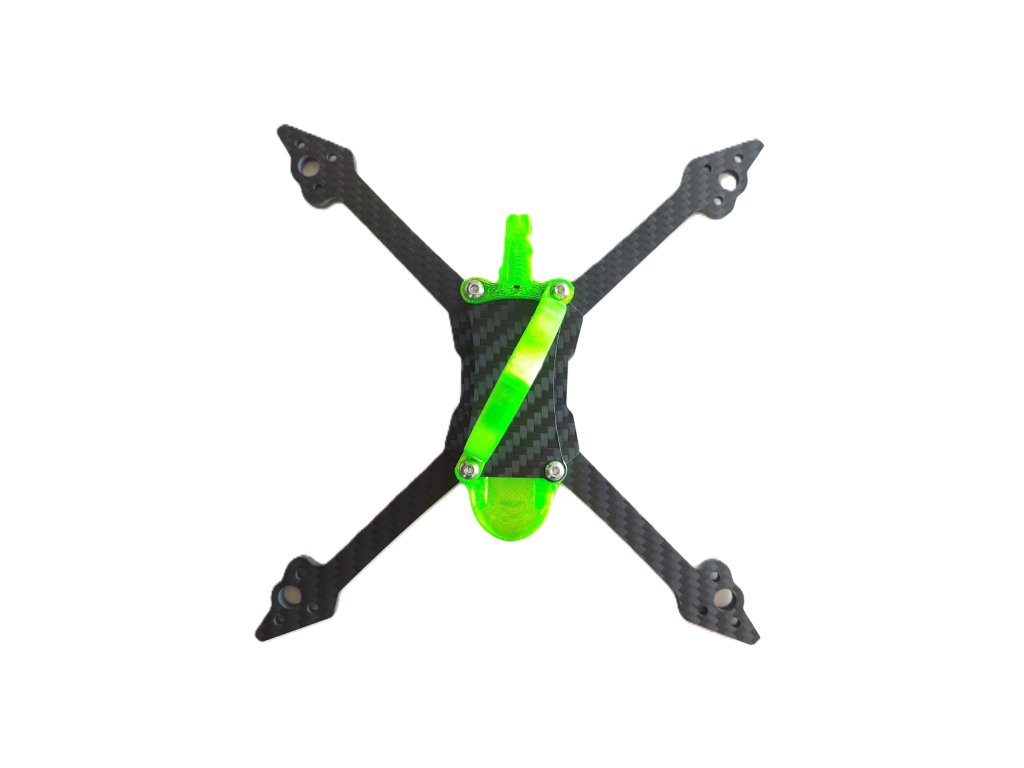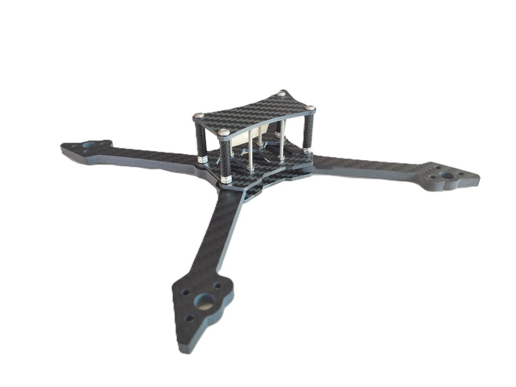 The frame of the XAERO Racer FPV racing drone is designed for overall rigidity and durability. All carbon parts are made of T300 carbon with a matte finish. The bottom wide fins protect the ESC against side impact. Height for the stack is 24mm (M2 bolts play a big weight saving role here). Designed for ESC and FC with a mounting pitch of 20x20mm. The frame can also accommodate an HDZero unit without problems. The holes in the bottom plate and on the arms are recessed (i.e. countersunk screws) - no more punctured batteries from screw heads! The space between the plates offers the possibility of using both 20mm and 15mm wide strapping (even 2x 15mm strapping side by side to firmly secure the drive battery).