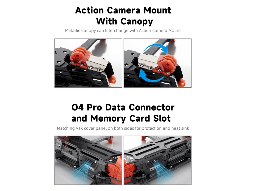 Chlazení VTX: Zadní strana bočnic obsahuje výřezy pro hliníkový chladič jednotky DJI O4 Pro.