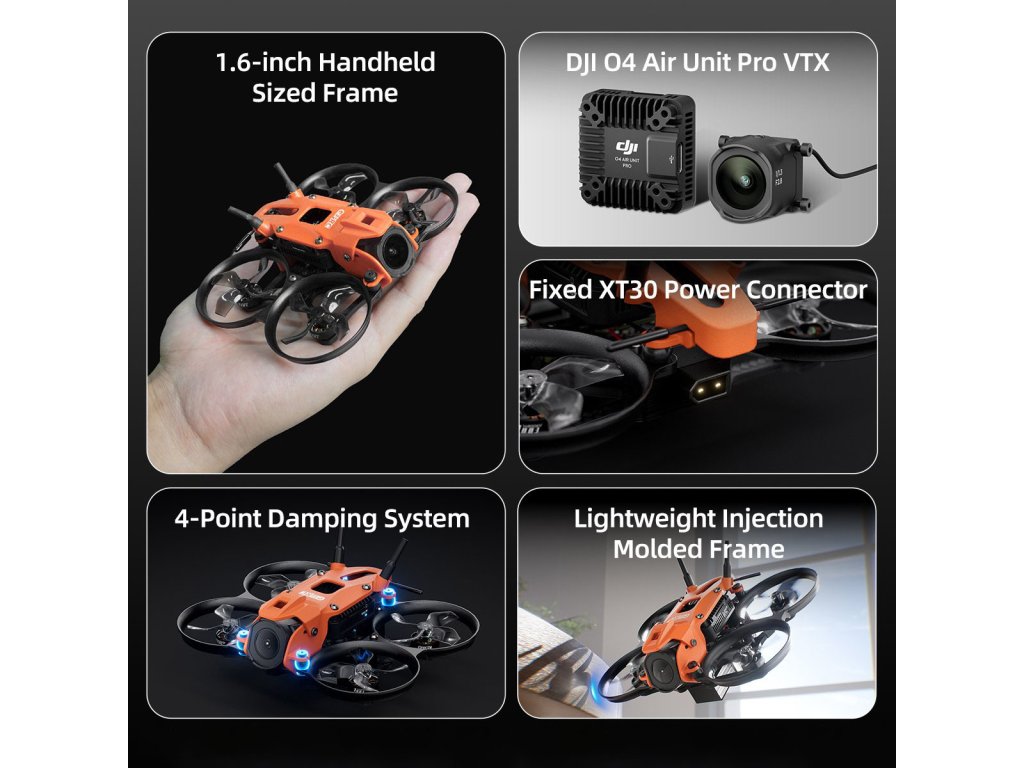 GEPRC DarkStar16 O4 PRO (ELRS 2.4G TinyWhoop) GEPRC DarkStar16 O4 PRO je nejnovější TinyWhoop FPV dron s kompaktním designem, který kombinuje přenosnost s nejmodernější technologií. Je vybaven digitálním HD systémem DJI O4 Air Unit Pro, který dodává ostré snímky a nabízí vylepšený výkon při slabém osvětlení. Rám o velikosti 1.6 palce je ideální pro létání v interiéru i exteriéru, přičemž integrovaný čtyřbodový tlumicí systém eliminuje vibrace a nežádoucí "jello efekt". Díky modulárnímu designu s rychlým uvolněním VTX modulu je údržba a servis velmi snadný. Dron váží pouhých 86 gramů (bez baterie) a je osazen konektorem XT30.