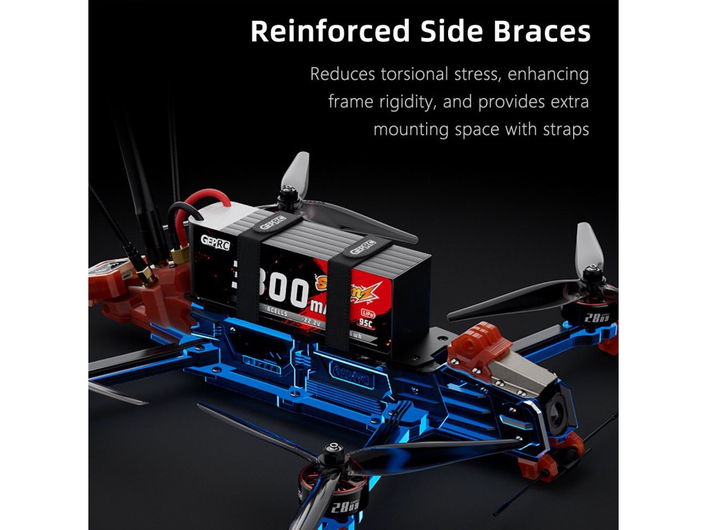 GEPRC MOZ7 V2 O4 PRO 6S ELRS (Long Range FPV dron) GEPRC MOZ7 V2 O4 PRO je špičkový 7.5" Long-Range dron s digitálním video přenosem DJI O4 Pro. Díky své velikosti a prodloužené letové době je ideální pro lety na dlouhé vzdálenosti v krajině nebo v horských oblastech. Kamera je umístěna před rameny, takže okraje vrtulí nejsou viditelné v záznamu DJI O4, což umožňuje kvalitní 4K záznam přímo z jednotky DJI O4 Pro. Tělo dronu má plastové boční kryty, které chrání citlivou elektroniku před nečistotami.