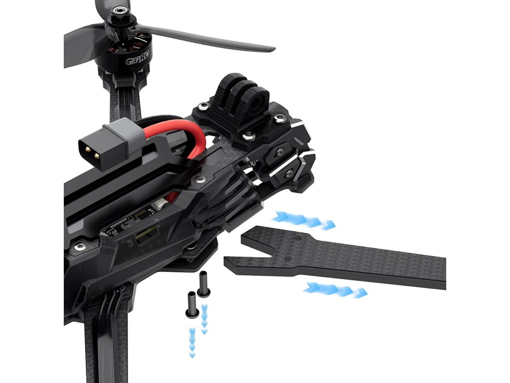 Rám používá 5mm tlustá ramena. Ramena jsou uchycena na dva šrouby a jejich výměna v případě poškození je tak velmi snadná. FPV kamera je chráněna hliníkovými bočnicemi. Samotné uchycení kamery je řešeno přes gumovou vložku, která pomáhá pohlcovat vibrace.