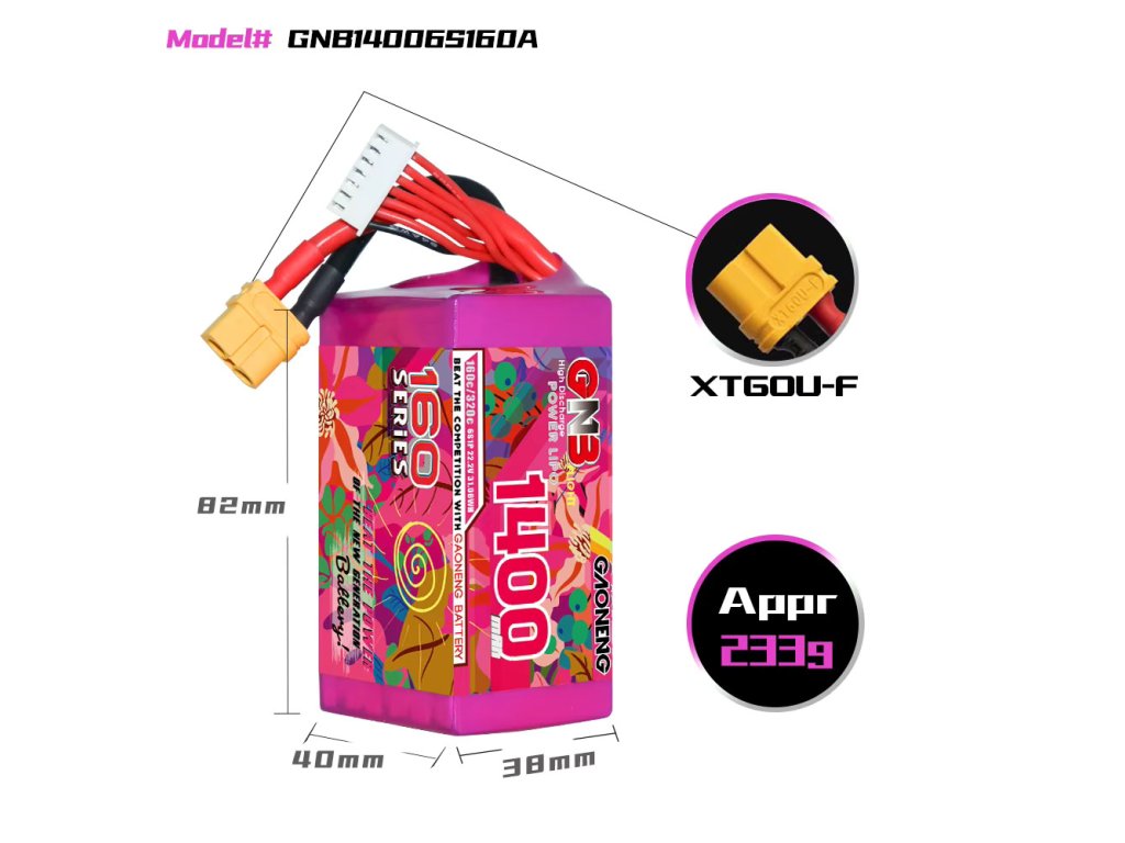 Vysoce výkonná LiPo baterie Gaoneng GNB 6S 22.2 V 1400 mAh 160C představuje ideální volbu pro náročné FPV piloty, kteří požadují špičkový výkon, stabilní napětí a nízký vnitřní odpor. Díky extrémnímu vybíjecímu proudu 160C dokáže poskytnout okamžitý nástup výkonu i při prudkých změnách zátěže, což z ní dělá perfektní volbu pro freestyle i racing létání.