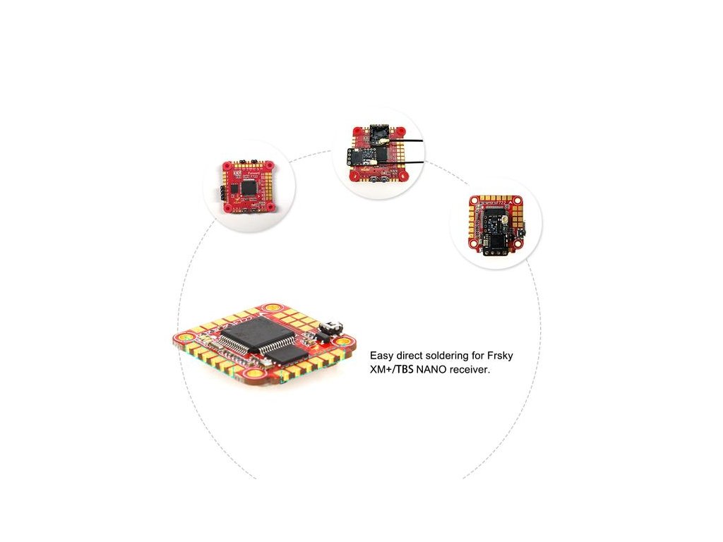 Připravené letovací pady přímo na FC: Frsky XM+ or TBS CROSSFIRE NANO Receiver.