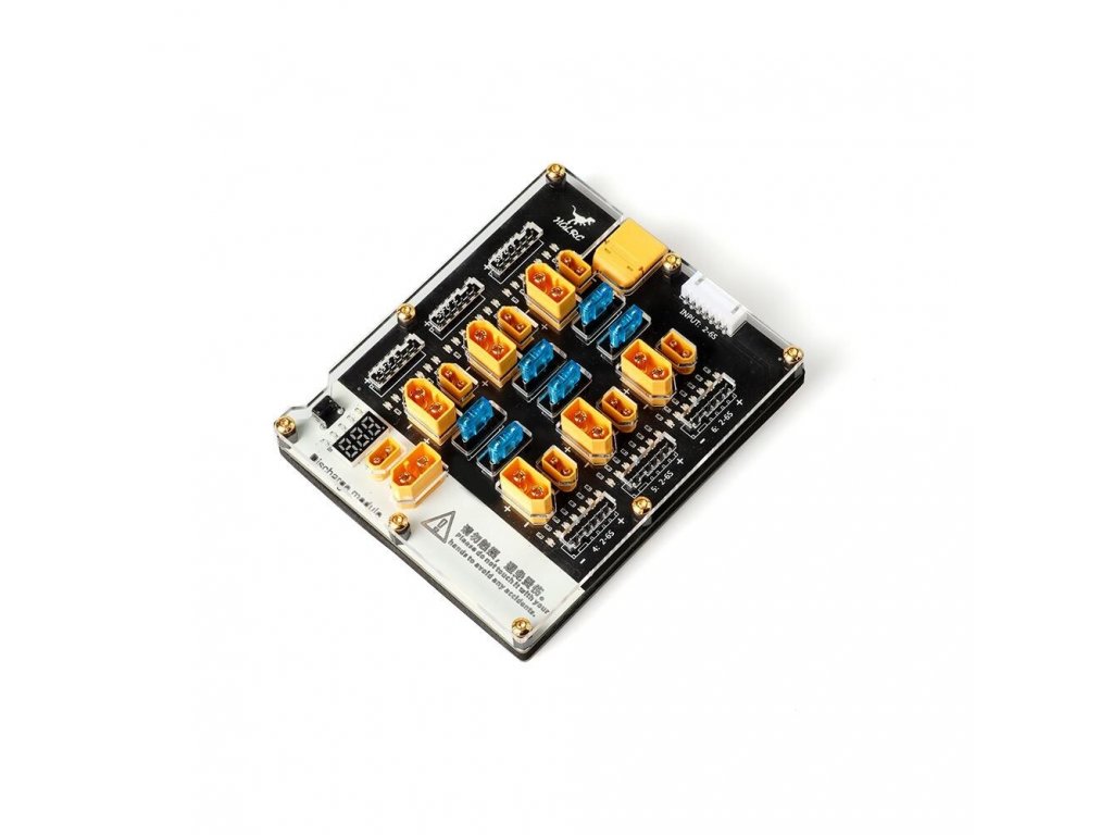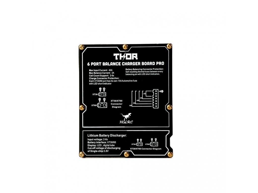 HGLRC Thor 6 Pro je deska pro paralelní nabíjení včetně vybíjecího modulu. Ochrana nabíjecího konektoru: Každý port XT30/XT60 má vlastní 15A automobilovou pojistku. Ochrana vyvažovacího konektoru baterie: U tepelných pojistek mezi každým vyvažovacím konektorem je indikace LED při samočinném resetování v situaci zkratu.