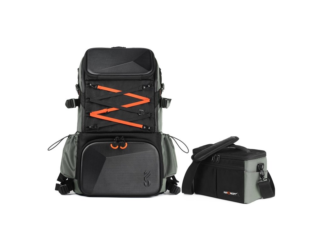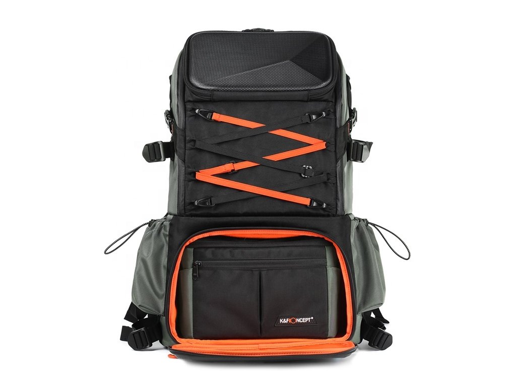 Materiál: Odolný, voděodolný nylon 900D s krytem proti dešti. Podšívka: 230T Twill Cloth s logem "K&F Concept". Prodyšná vzdušná síťovina pro oblast zad. Ramenní popruh včetně zadní části batohu lze nastavit na velikost L, M, S spolu s nastavitelnou hrudní přezkou, kde tyto systémy spolupracují na rovnoměrném rozložení hmotnosti a snížení zátěže. Přední tvrdý ochranný plášť a konstrukci předního elastického pásu lze použít na UAV, přilbu, outdoorový stan atd.