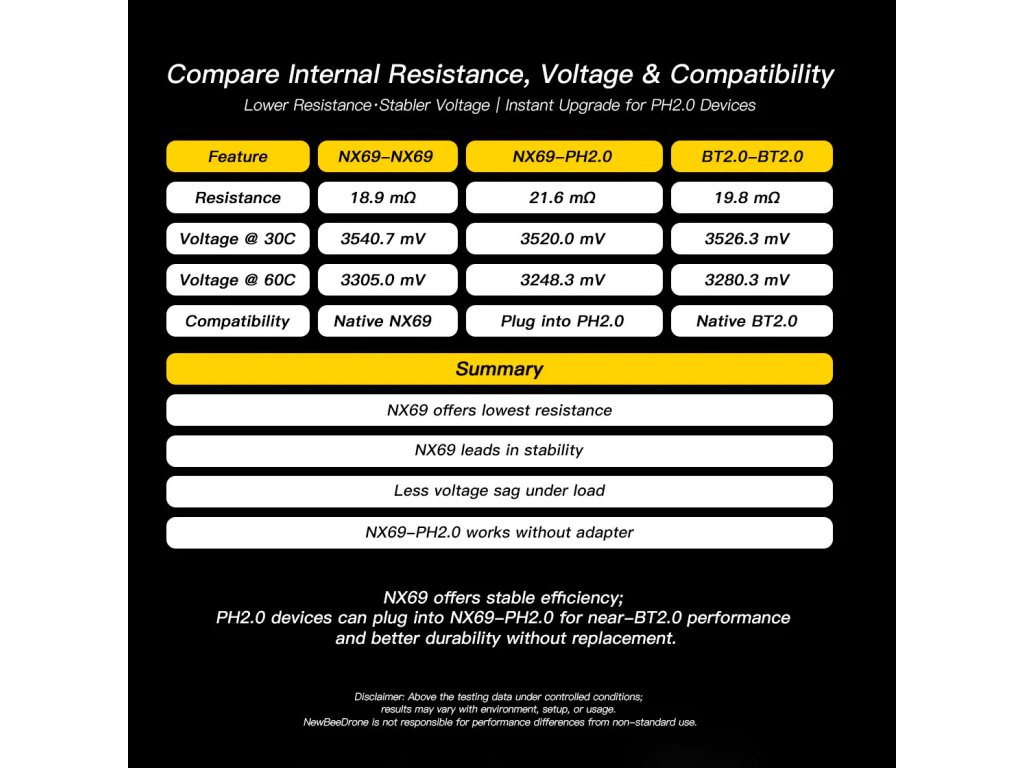NewBeeDrone Nitro Nectar NX69 300 mAh 1S HV LiPo (4-pack) je prémiová sada čtyř vysokovýkonných baterií určených pro 65mm whoopy a další ultra-lehké 1S FPV platformy. Moderní konektor NX69 poskytuje vyšší proudovou kapacitu, nižší odpor a výrazně menší pokles napětí oproti starším standardům PH2.0 nebo BT2.0.