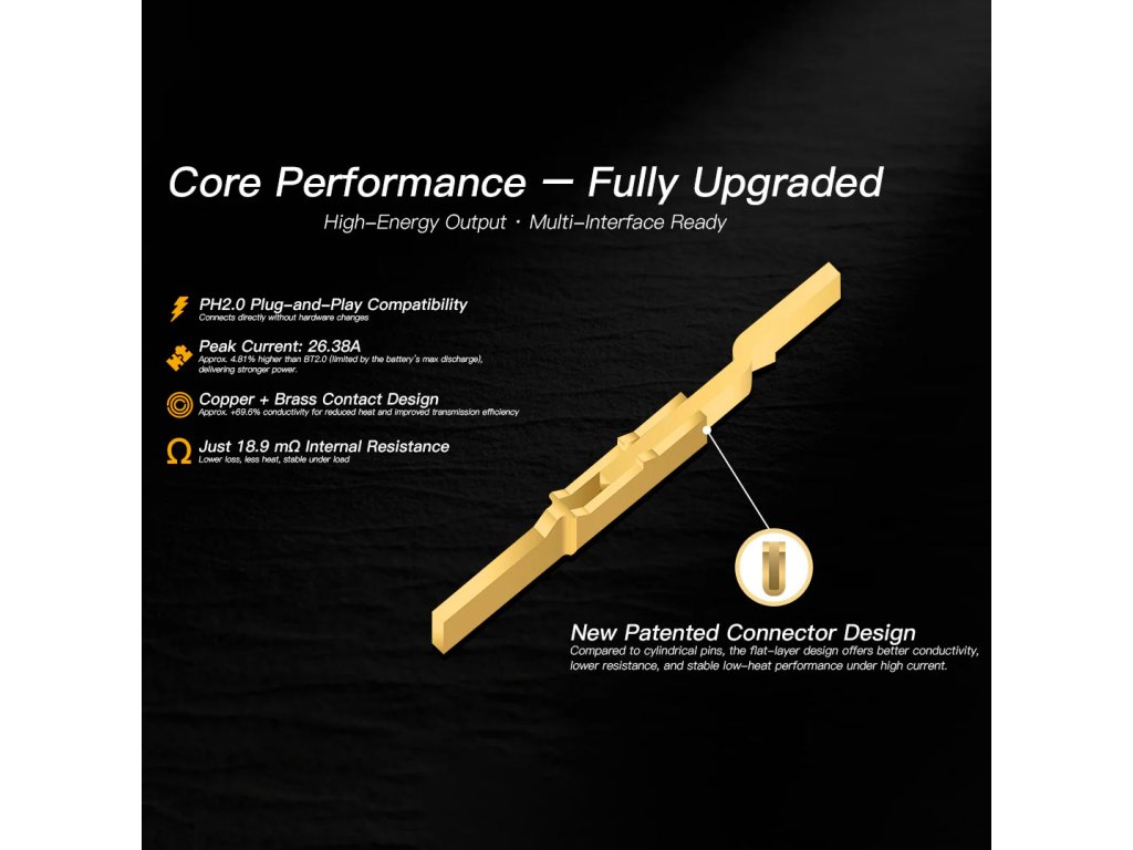 Baterie jsou zároveň plně kompatibilní s nabíječkami, které používají PH2.0 konektor – bez nutnosti jakékoli redukce. Díky tomu lze baterie používat okamžitě se stávajícím vybavením.