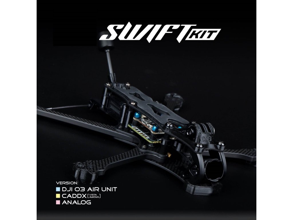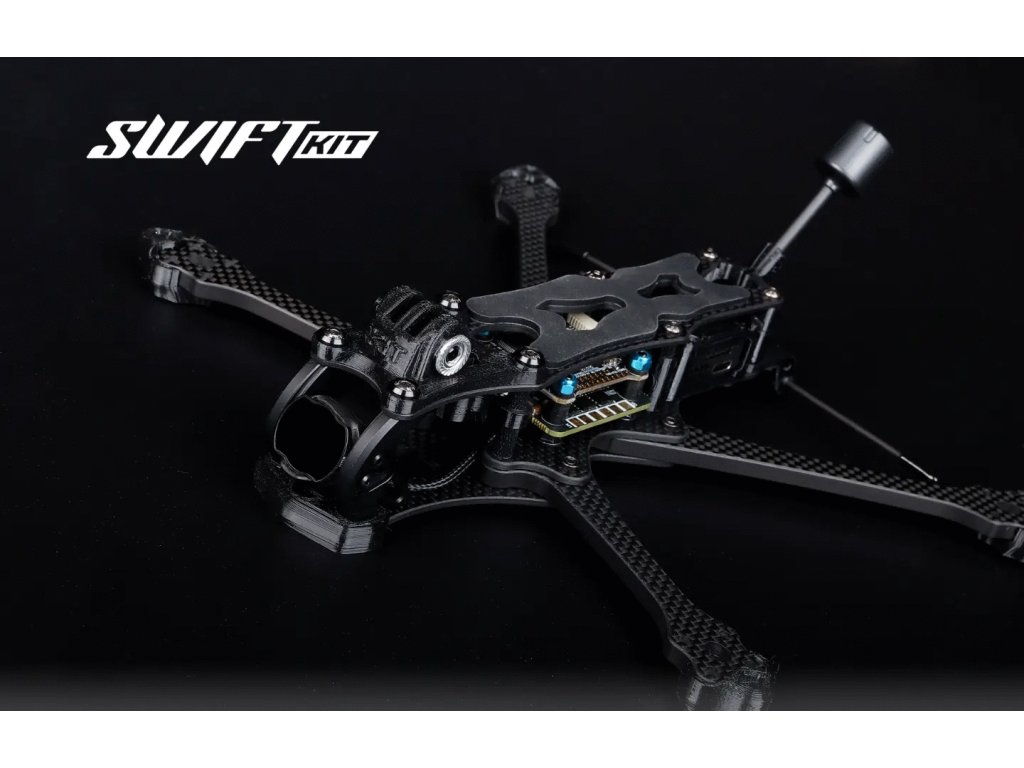 Velmi kvalitní FPV rám dronu plně kompatibilní s novou jednotkou videa DJI O3. Samozřejmostí je možnosti instalace jakéhokoliv systému přenosu videa. Kvalitní karbon a pevná konstrukce tohoto rámu zaručí méně vibrací do jednotky FC a tím i hladší letové vlastnosti. Další předností rámu Swift je, že vrtule jsou mimo záběr FPV kamery. Set obsahuje veškeré 3D tisky, které jsou potřeba k sestavení. (obal GoPro kamery není součástí).