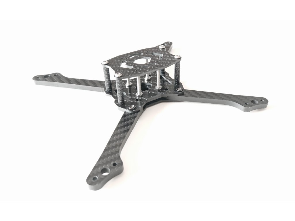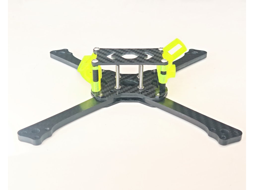 Rám závodního FPV dronu Vortex V2 je navržen pro celkovou tuhost a odolnost. Základem rámu jsou dělená ramena a veškeré karbonové díly jsou vyrobeny z uhlíku prepreg T300. Spodní široká plata chrání ESC proti bočnímu nárazu. Výška pro stack činí 24mm. Určeno pro ESC a FC o rozteči pro uchycení 20x20mm i 30x30mm. Rám bezproblémů pojme i jednotku HDZero, Walksnail nebo DJI, která je zároveň chráněna horním platem. Díry ve spodním platu jsou zahloubené (tzn zapuštěné šrouby) - již žádné proražené baterie od hlaviček šroubů! Prostor mezi platy nabízí možnost 15mm širokého strapu.